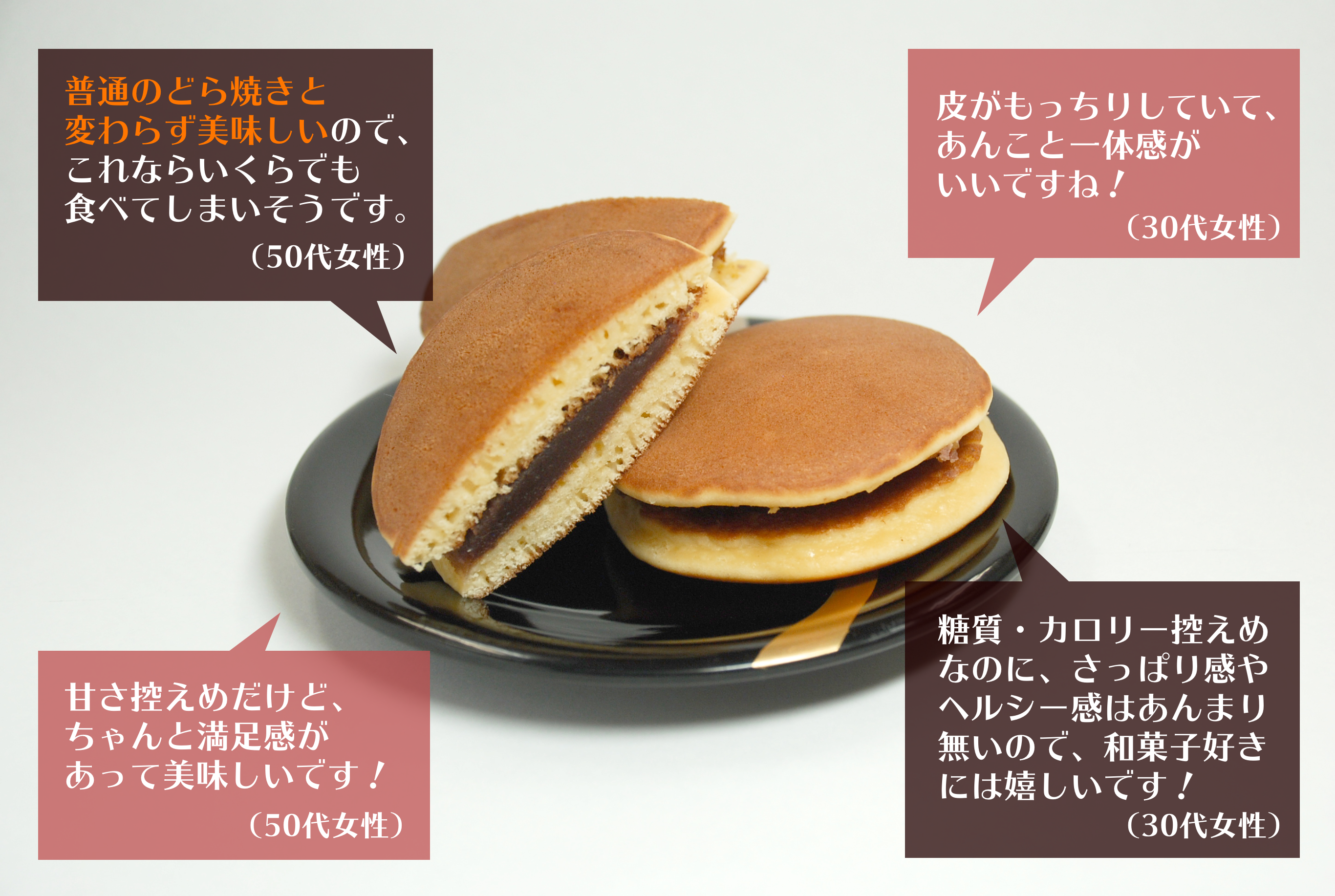 糖尿病や血糖値の気になる方、ダイエット中の方たちにも安心して本物の和菓子を楽しんでもらいたい、そのような想いから砂糖を一切使用せず、3年にわたって食品工学の専門家や和菓子技術指導員と交えて開発を続けてきた低糖質和菓子の商品化を実現、第一弾として、「低糖質どら焼き」を販売しました。